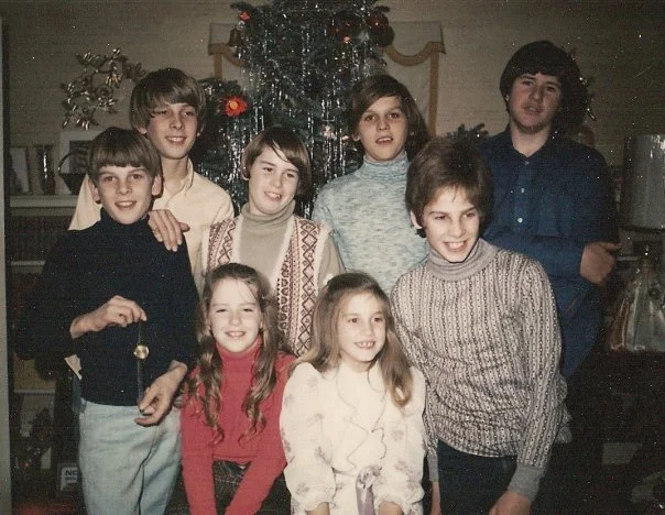 My father's side of the family - his brothers, sister and cousins at Christmas. My dad is the one in the smashing grey turtleneck!