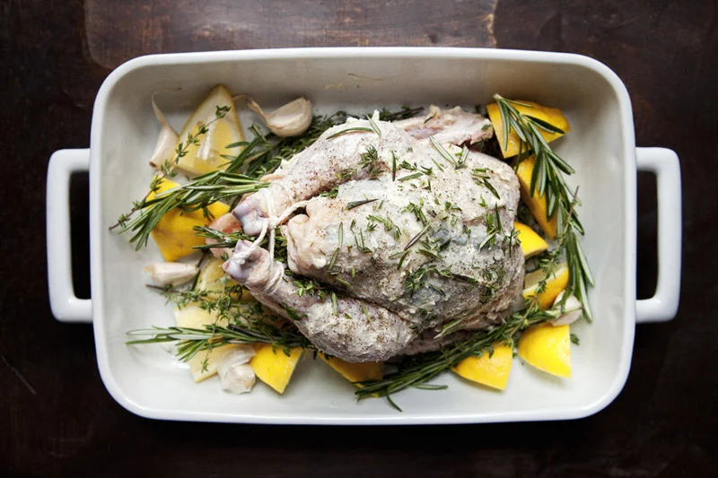 Using your forefinger, gently run your finger under the layer of skin along the neck, separating the skin from the meat of the chicken, but being sure not to tear the skin. Once the skin is separated, slide a few of the thin lemon slices between skin and meat. I sometimes like to add a sprig of thyme under the skin as well.