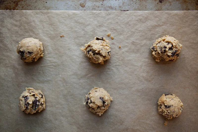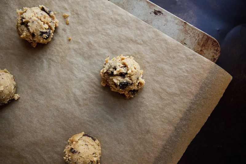 Remove dough from the refridgerator and drop melon-baller sized dough onto the parchment paper, about 3 inches apart. I like to bake 9 at a time, just to be safe.