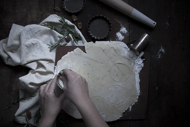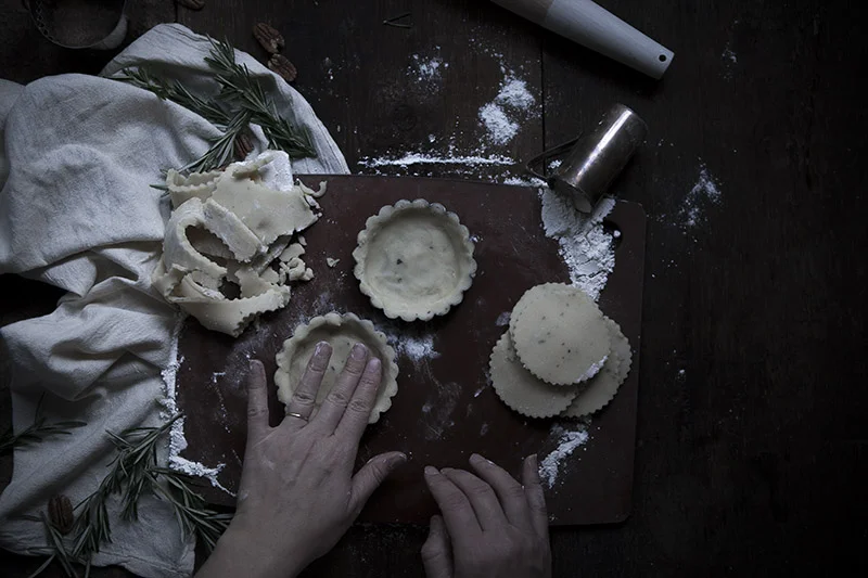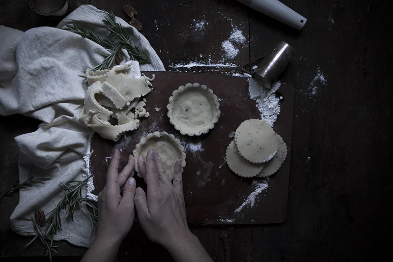 Roll out the dough with a rolling pin until ¼ inch thick, then using a biscuit cutter, cut out eight circles. Press each circle into the bottom of each tart tin. Using the scraps, press the extra dough along the edges of the tart tin so you have a smooth edge. Pierce the bottoms of the tarts with a fork, and place in the freezer to chill while you make the filling.