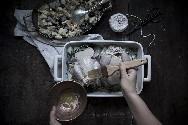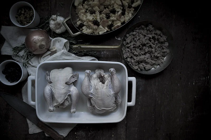 Once the hens are cleaned and rinsed and patted dry with a clean kitchen towel, place them in a baking dish that is at least 3 inches deep.