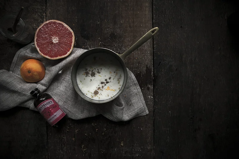 In a saucepan, warm the milk over medium heat. Add the rose water and citrus zest. Stir continuously until the milk is heated but not bubbling.