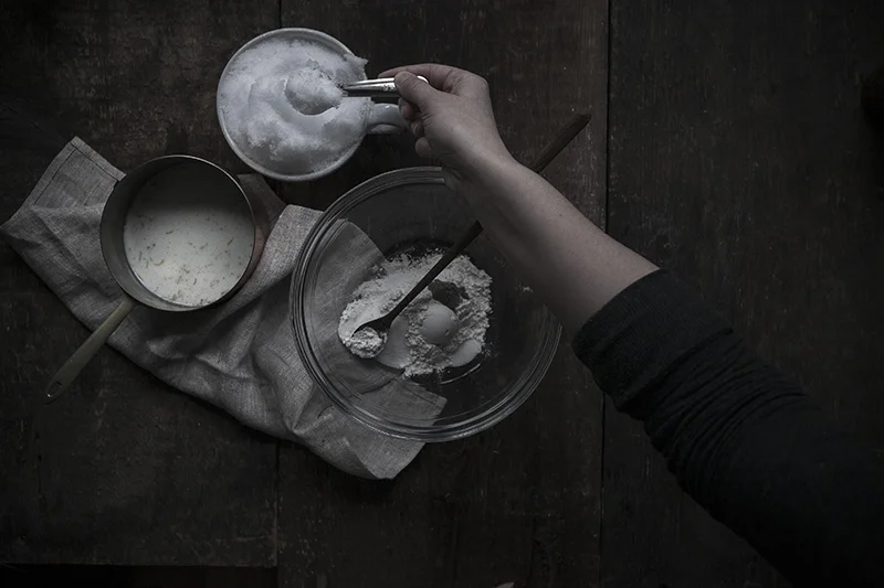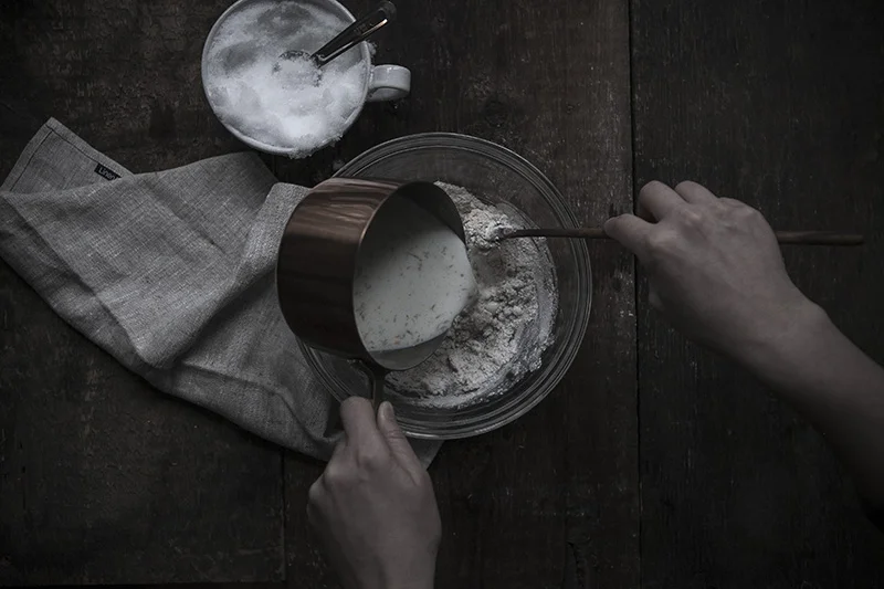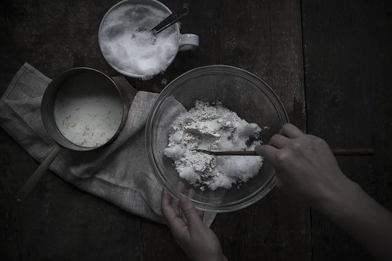 Add the snow to the flour mixture and mix until melted and a dough begins to form. Add the heated milk mixture to the dough and stir until a smooth batter forms.