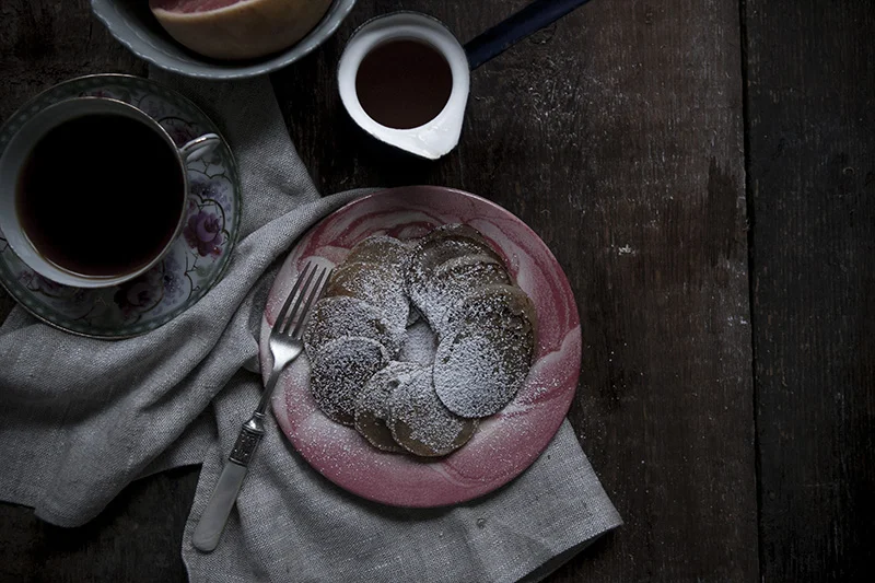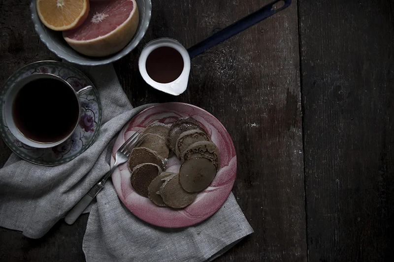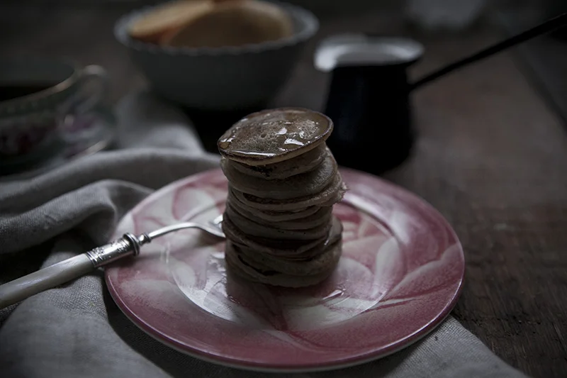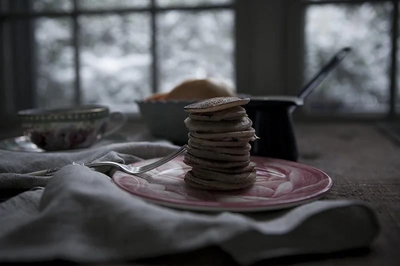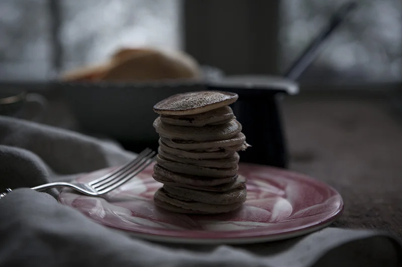 Heat a cast iron skillet over medium high heat and melt the butter. Once the butter has melted and the skillet is hot, spoon pancake mixture in small round on to the skillet. I like to make mine like small silver dollar sized cakes. Flip the cakes once one side is golden brown and cooked. Remove from the heat once both sides of the cakes are golden.