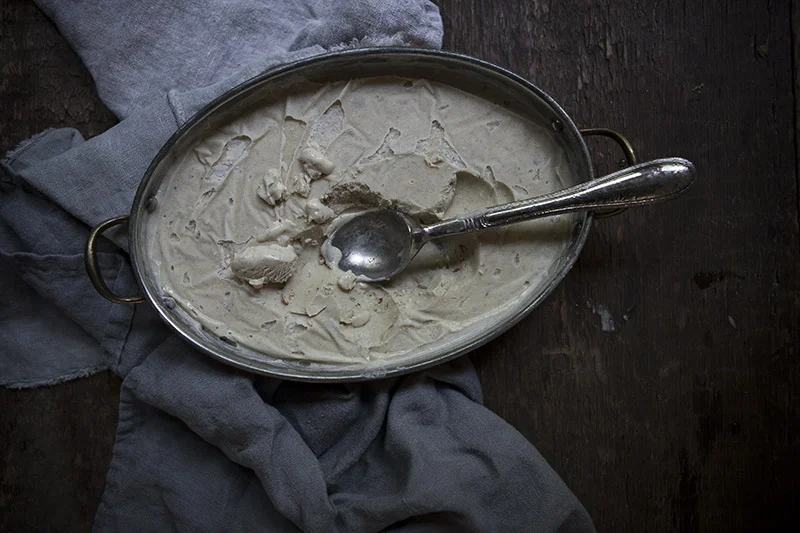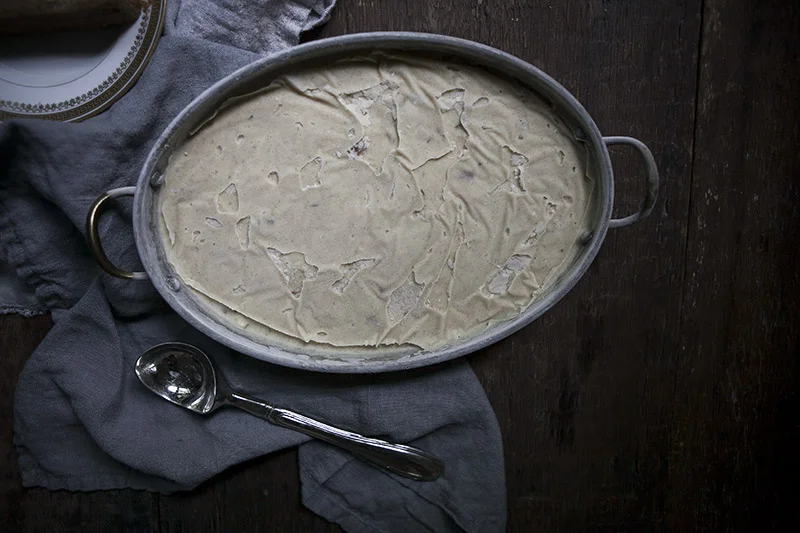 When you have reached "soft serve" consistency, mix in the almonds by hand. Once the almonds are fully incorporated, spoon the ice cream in to a serving dish and freeze for 12 hours or overnight, again covered in plastic pressed to the surface top.